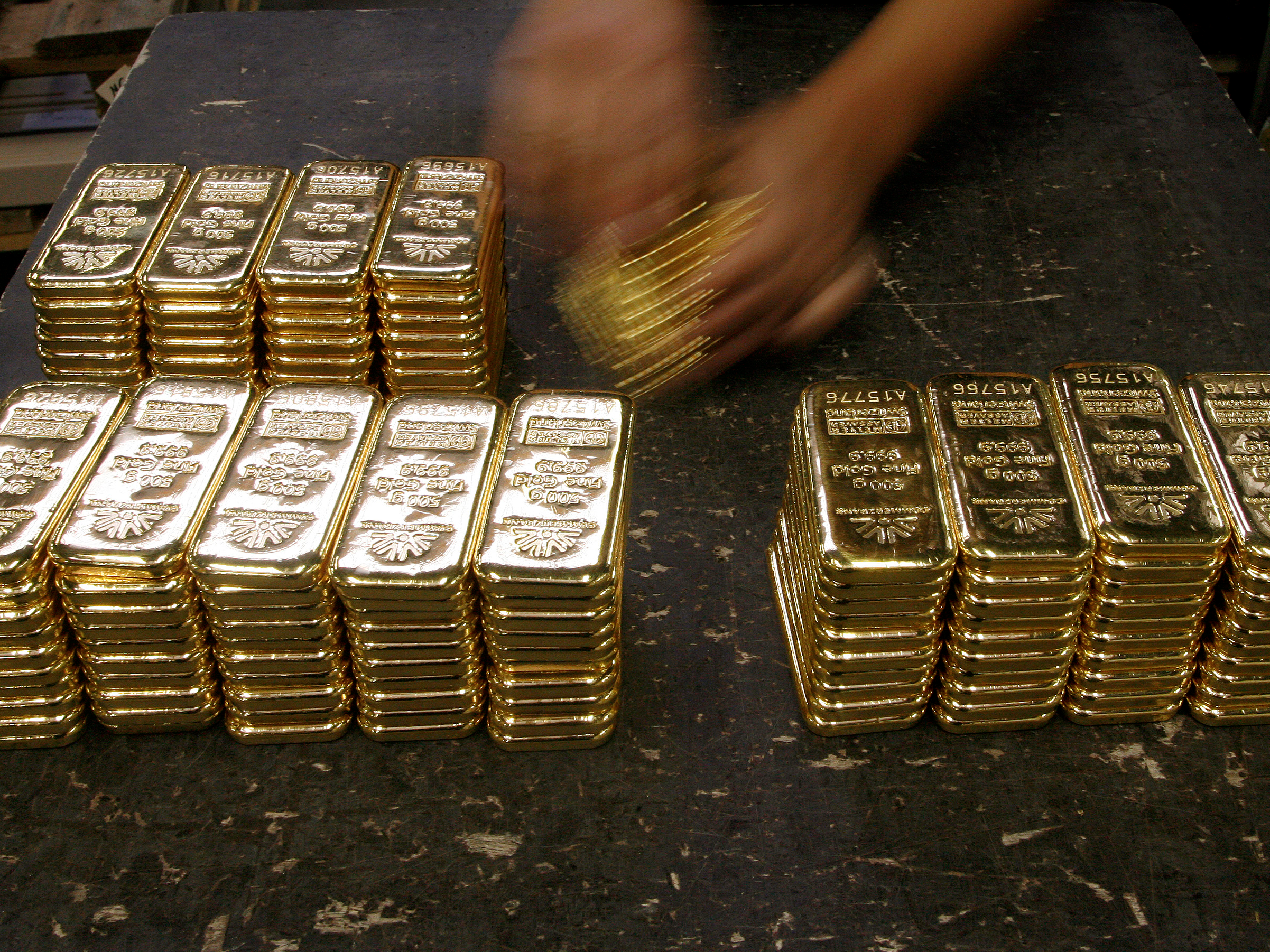 Этот золотой слиток на 400 унций по цене 2 000 долларов за унцию стоит 800 000 долларов наличными рядом с ним.