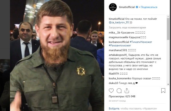 Мы с каждым днём наблюдаем его духовный, патриотический, гражданский и спортивный рост. Конечно, в юности у любого музыканта бывают одни ценности, порой и сомнительные, но БОЛЬШОЙ артист с годами взросления находит в себе силы и талант работать на общечеловеческие ценности. Уверен, что через такой этап уже сумел пройти и Тимати. Никому и никогда не удавалось стать кумиром всех до единого. Такого в природе не бывает. Но концерты в крупных городах и растущая популярность говорят, что Тимати шаг за шагом достигает всё новых и новых творческих высот. Дорогой друг, желаю тебе крепкого здоровья, дефицитом которого ты не страдаешь, желаю успехов, счастья и благополучия! Мы тебя всегда ждём и всегда тебе рады!» – написал Кадыров в Instagram.