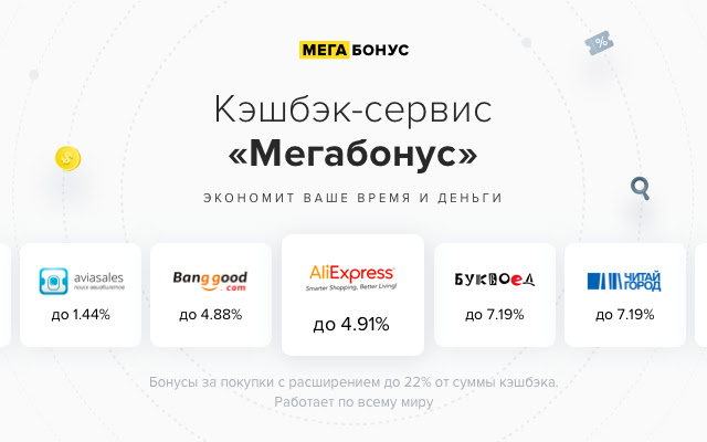 Megabonus — российский кешбек-сервис, который входит в тройку лидеров на территории России и стран ближайшего СНГ. На данный момент у Megabonus более 800 магазинов-партнёров, и их список продолжает расти. Магазины предлагают товары более чем из 20 категорий, а их география охватывает весь мир. Среди магазинов-партнёров такие известные площадки, как Booking.com, AliExpress, JD.com, «Связной», «М.Видео», Banggood, «ЛитРес» и многие другие. Megabonus генерирует своим магазинам-партнёрам более 17 млн $ GMV. Каждый день к кешбеку подключаются новые магазины, которые сразу становятся доступны и партнёрам «Мегабонус».