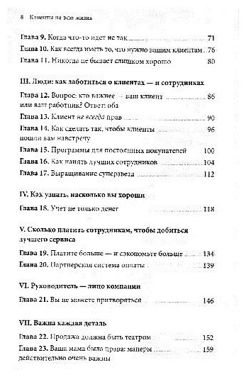 В этой книге рассказывается о том, как каждый клиент превратиться в лояльного покупателя, который пойдет к вам за тем, что ему нужно. Есть советы, как себя вести, если покупатель все еще ошибается, как определить свои потребности и удовлетворить их, чтобы обе стороны остались в выигрыше. Автор пишет не только об общении сотрудника и клиента, но и об отношениях руководителя и сотрудников.Он говорит о заработной плате, общей атмосфере, чистоте и уюте, дизайне и многих других мелочах. На конкретных примерах он объясняет, как это делать и как избежать распространенных ошибок. Несмотря на то, что книга написана американским автором для аудитории с другим менталитетом, многие рекомендации будут полезны и российским бизнесменам.