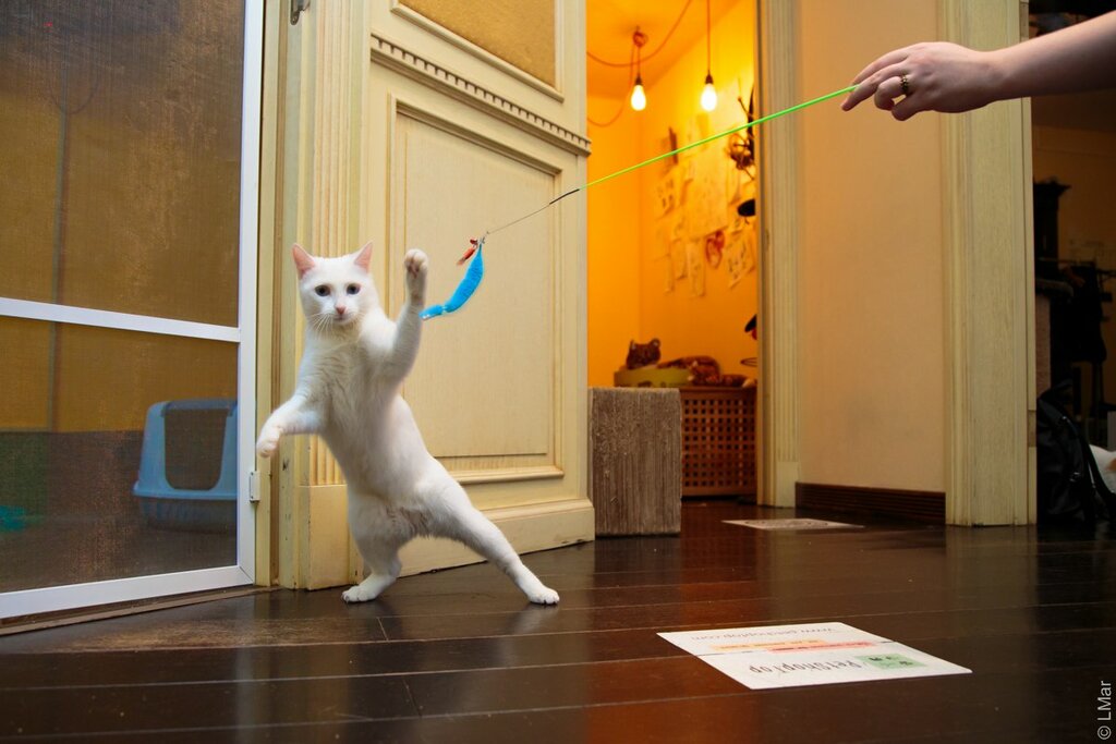 По прибытии персонал предлагает широкий выбор напитков, которые всегда сопровождаются имбирным печеньем в форме кошки. С напитком и закуской в руке вас проводят наверх, в кошачий дом. Помещения достаточно, чтобы у 15 взрослых кошек была своя территория.Некоторым нравится немного человеческого флирта, нежно касаясь ног клиентов или сидя у кого-то на коленях для оптимального положения ласки. Другие предпочитают греться на солнышке или находить сонное утешение в одной из многочисленных кроватей и картонных закоулков, предоставленных персоналом. В углу мерцающий дискотечный шар и шлем штурмовика Star Wars на стене — это лишь некоторые из самых тематических штрихов, которые сопровождают игровую площадку с когтеточкой и причудливые кошачьи игрушки, разбросанные по полу.