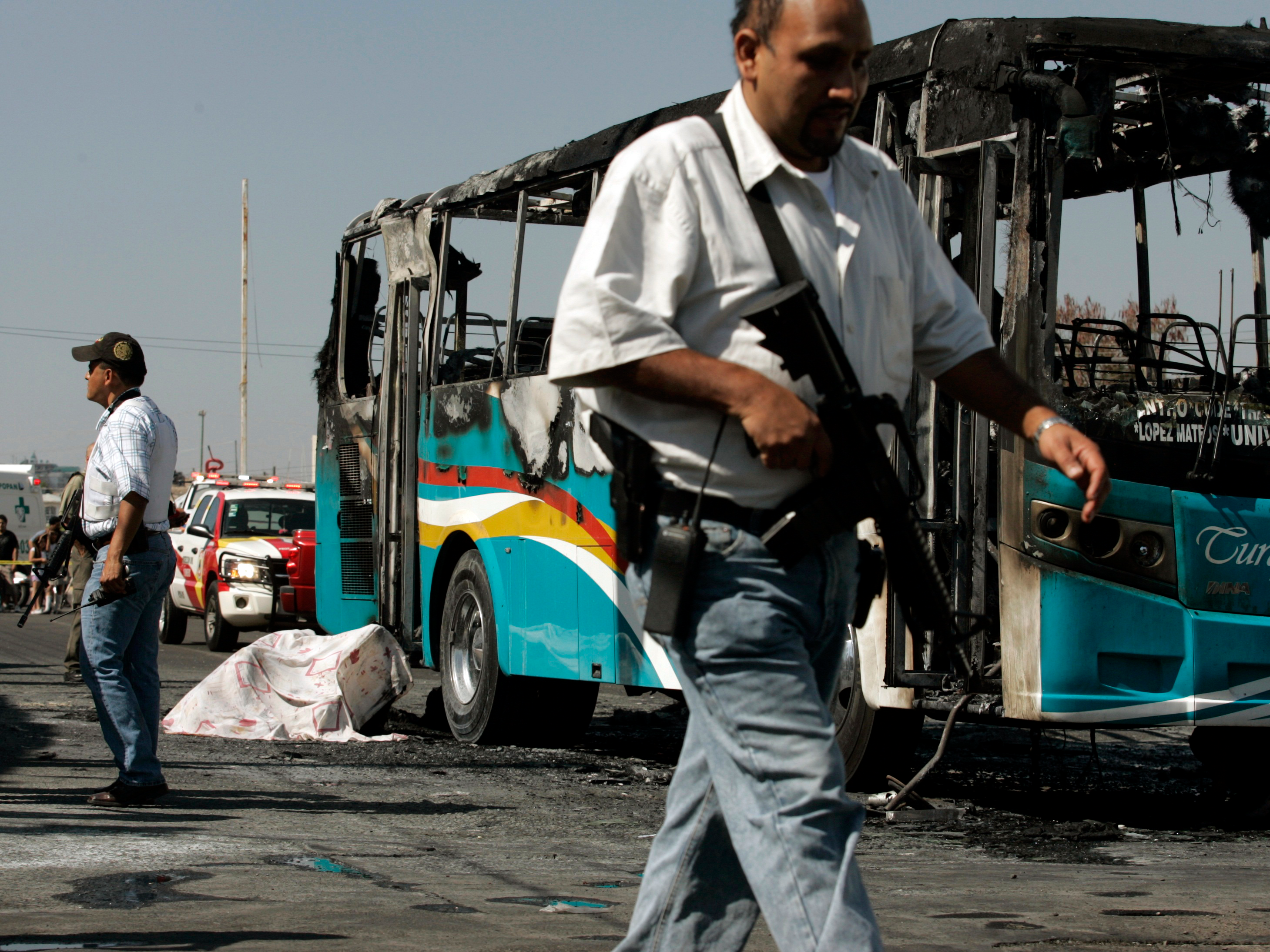 Преступники не просто ушли от преследования — двум сотрудникам правоохранительных органов в итоге пришлось удирать от вооруженных боевиков. Далеко им уйти не удалось: на пересечении улиц Конституционалистов и Нарсисо Мендосы дорогу полицейскому автомобилю перегородил грузовик, водитель которого расстрелял правоохранителей в упор.