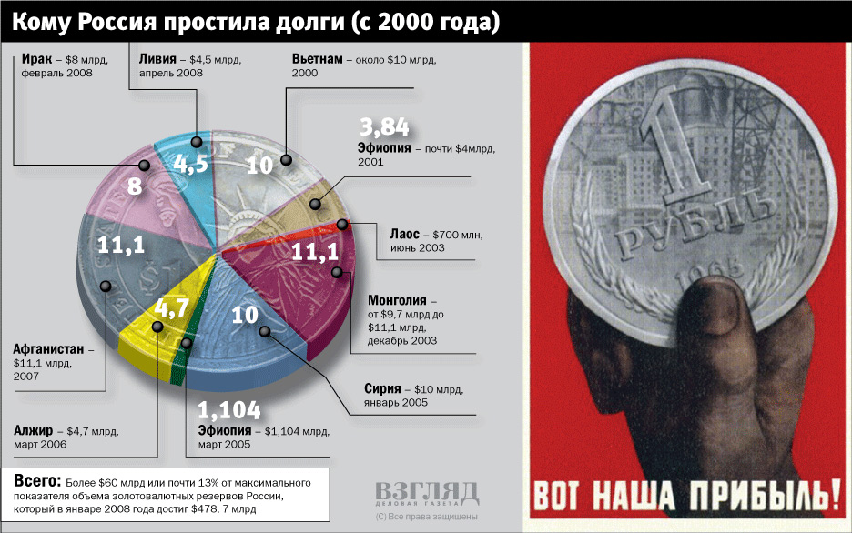 Долг других стран перед Россией по тем кредитам, которые выдавал еще Советский Союз, после списания и реструктуризации составляет около 5 млрд долларов, уточняло издание.