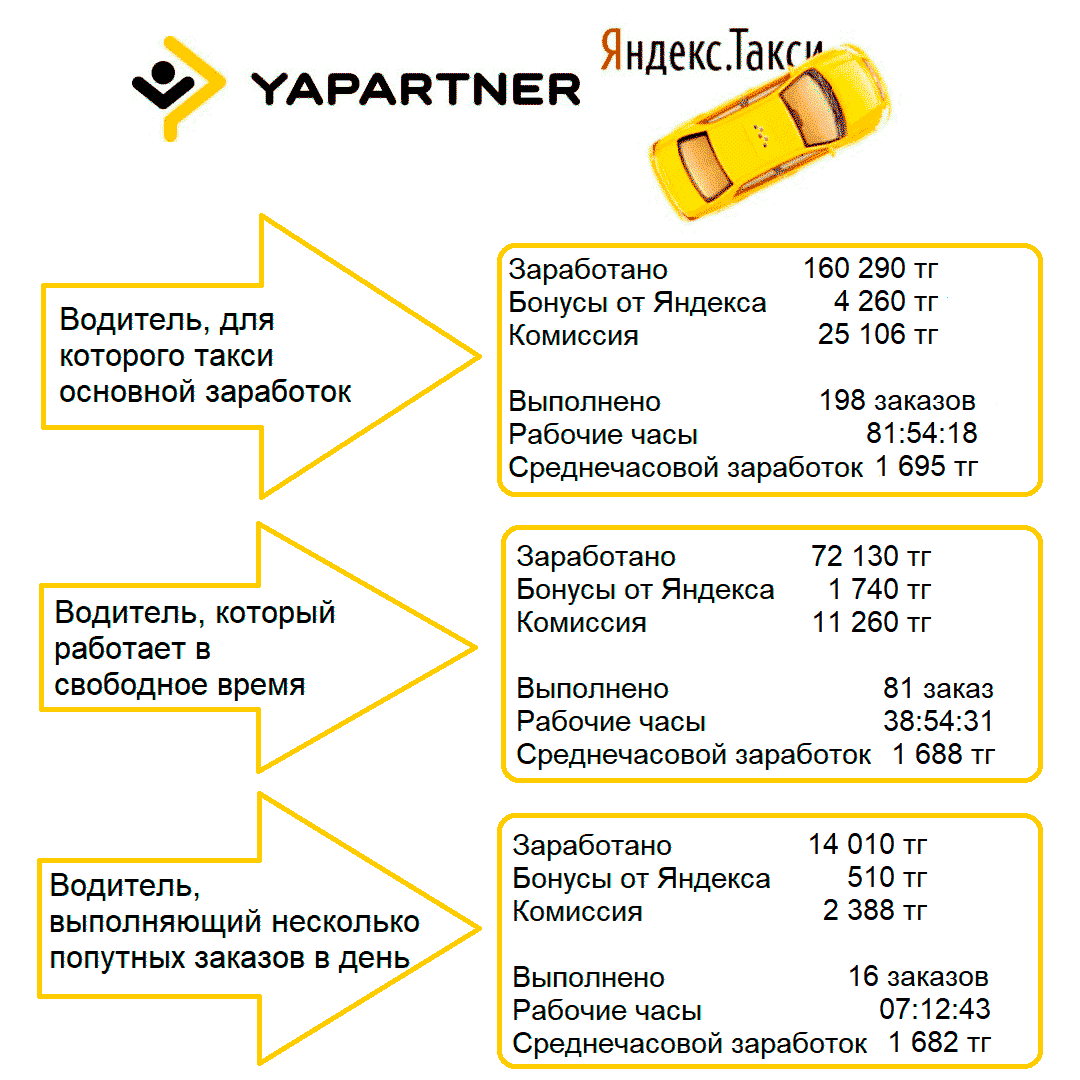 Приведенные выше модели заработка наглядно показывают разницу в доходах Яндекс.Такси в зависимости от формы собственности на автомобиль. Лучший способ заработать — это отсутствие ежемесячных платежей по кредиту или лизингу. Некоторые таксисты выходят из ситуации аренды машины на двоих, то есть работают напарниками, посменно.