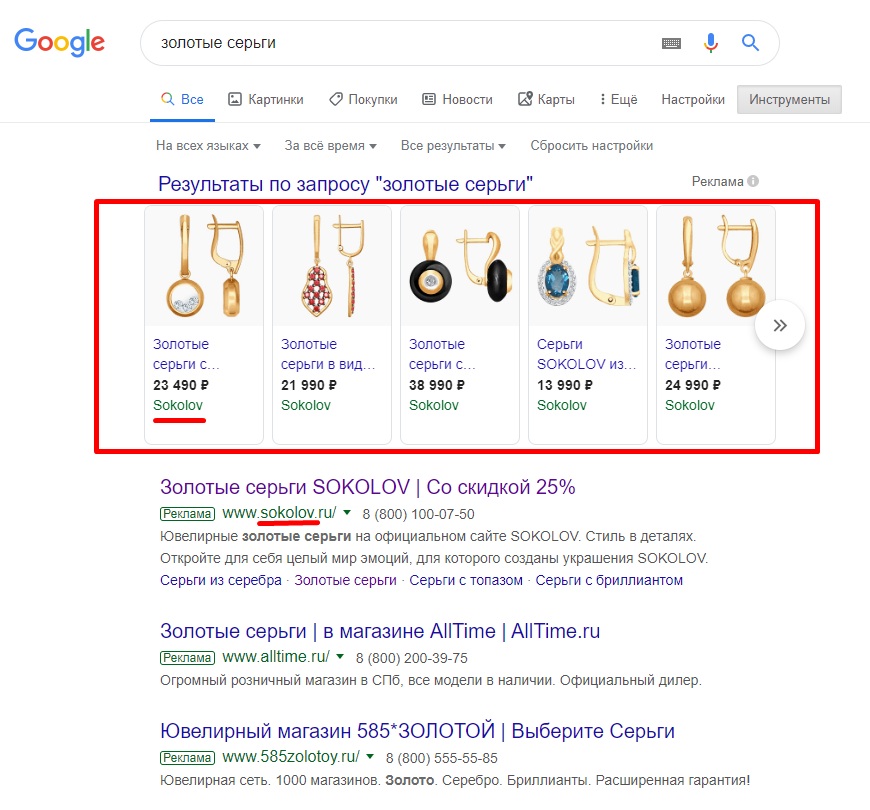 Google Shopping (гугл шопинг) – это один из вариантов настройки рекламных кампаний в Google, реклама ваших товаров с помощью товарных объявлений в самом видном месте поисковой выдачи. Пример, пользователь хочет купить айфон 11, он пишет в поиске “купить айфон 11” и получает не просто ссылки на сайты или инетрнет-магазины, а видит сразу товарные объявления